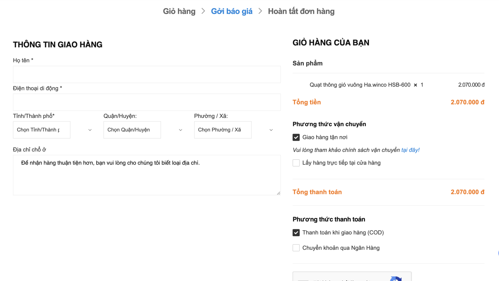 BƯỚC 4: Bấm "Tiếp tục điền thông tin giao hàng, phương thức vận chuyển và phương thức thanh toán"