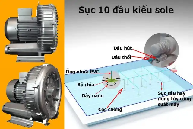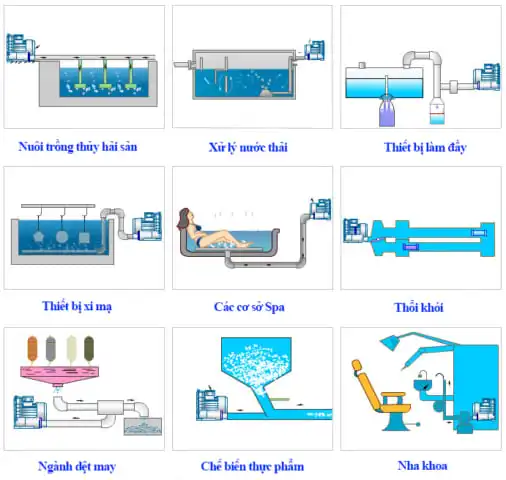 - Sử dụng để có thể tạo ra luồng khí sau đó thổi vào đường ống dẫn để bơm khí xuống ao hồ phục vụ nuôi trồng thủy hải sản, cấy vi sinh